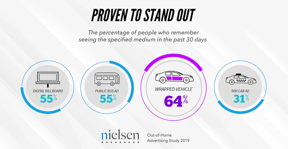Vehicle wraps are proven to be the most memorable form of transit advertising. A study done by Nielsen in 2019 surveyed 999 participants and asked “When was the last time you noticed [_Medium_] advertising”. The results were as following: